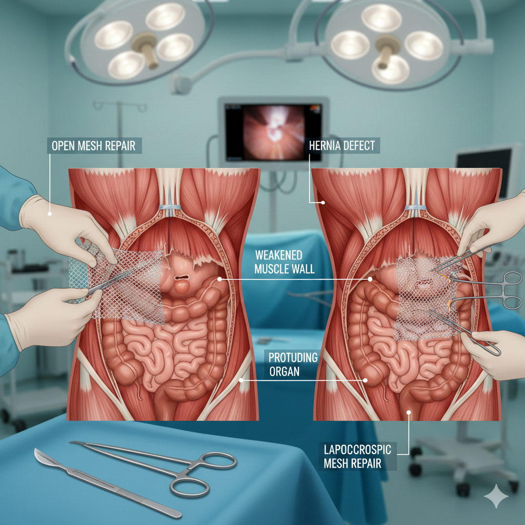 A condition where internal organs protrude through a weakened muscle wall, commonly seen in the abdomen or groin. Treated using open or laparoscopic mesh repair depending on complexity.