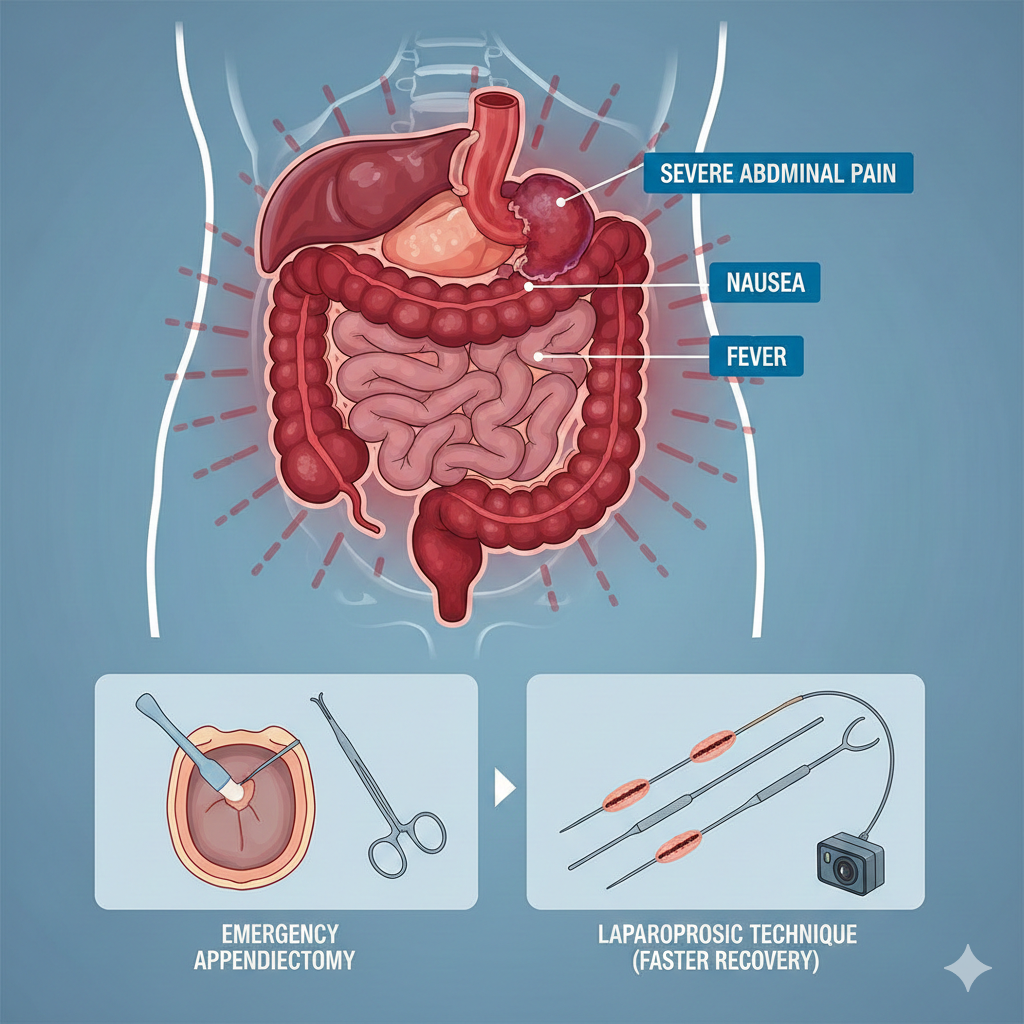 Inflammation of the appendix causing severe abdominal pain, nausea, and fever. Treated through emergency or planned appendicectomy, preferably using laparoscopic techniques for faster recovery.