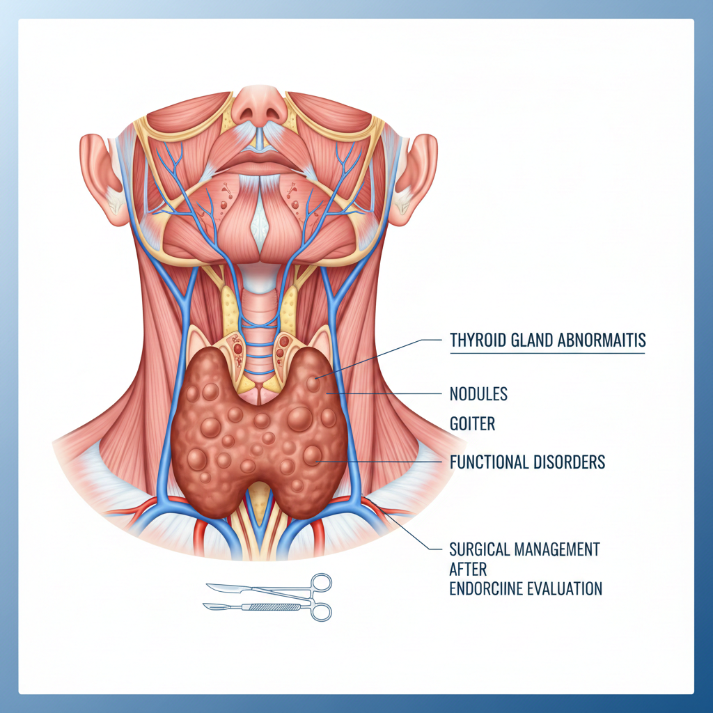 Thyroid gland abnormalities such as nodules, goiter, or functional disorders requiring surgical management after endocrine evaluation.