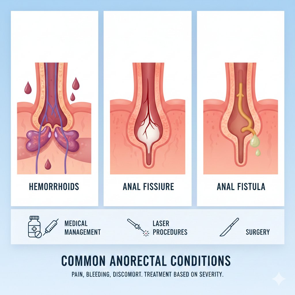 Common anorectal conditions causing pain, bleeding, and discomfort during bowel movements. Treated using medical management, laser procedures, or surgery based on severity.