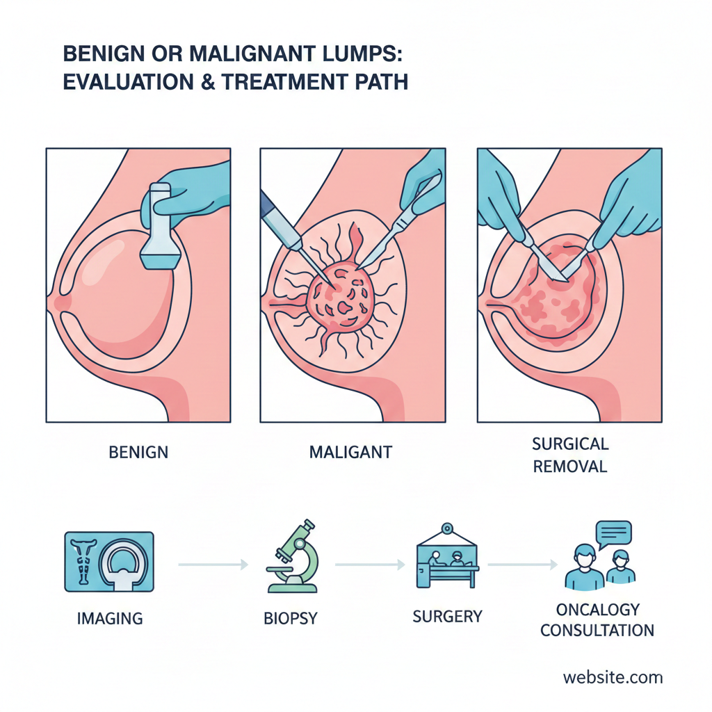 Benign or malignant lumps evaluated through imaging and biopsy, followed by surgical removal when necessary, in coordination with oncology services.