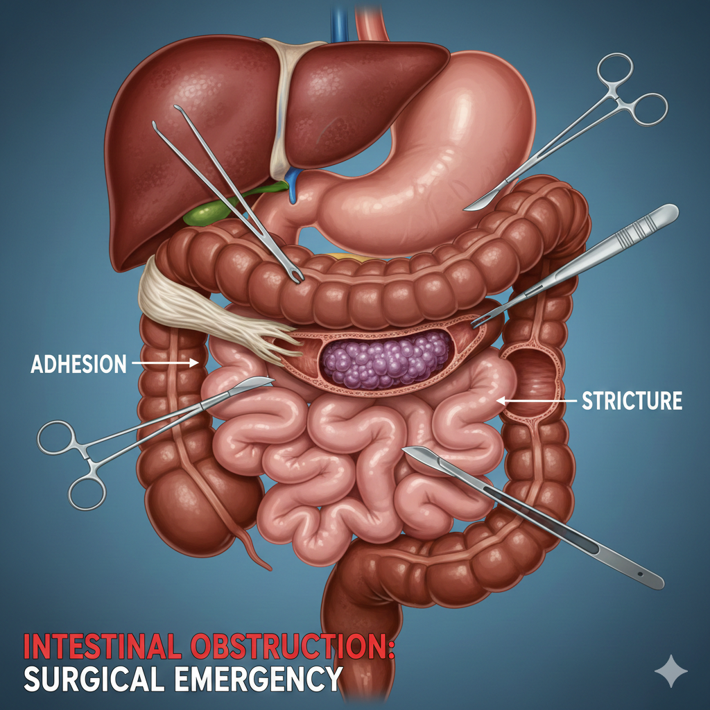 Obstructions in the intestines caused by adhesions, tumors, or strictures, requiring prompt surgical evaluation and intervention.