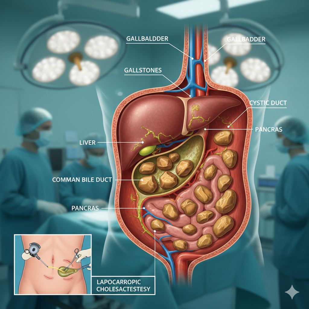 Hard deposits formed in the gallbladder that can cause pain, infection, or digestion issues. Managed through laparoscopic cholecystectomy to safely remove the gallbladder.